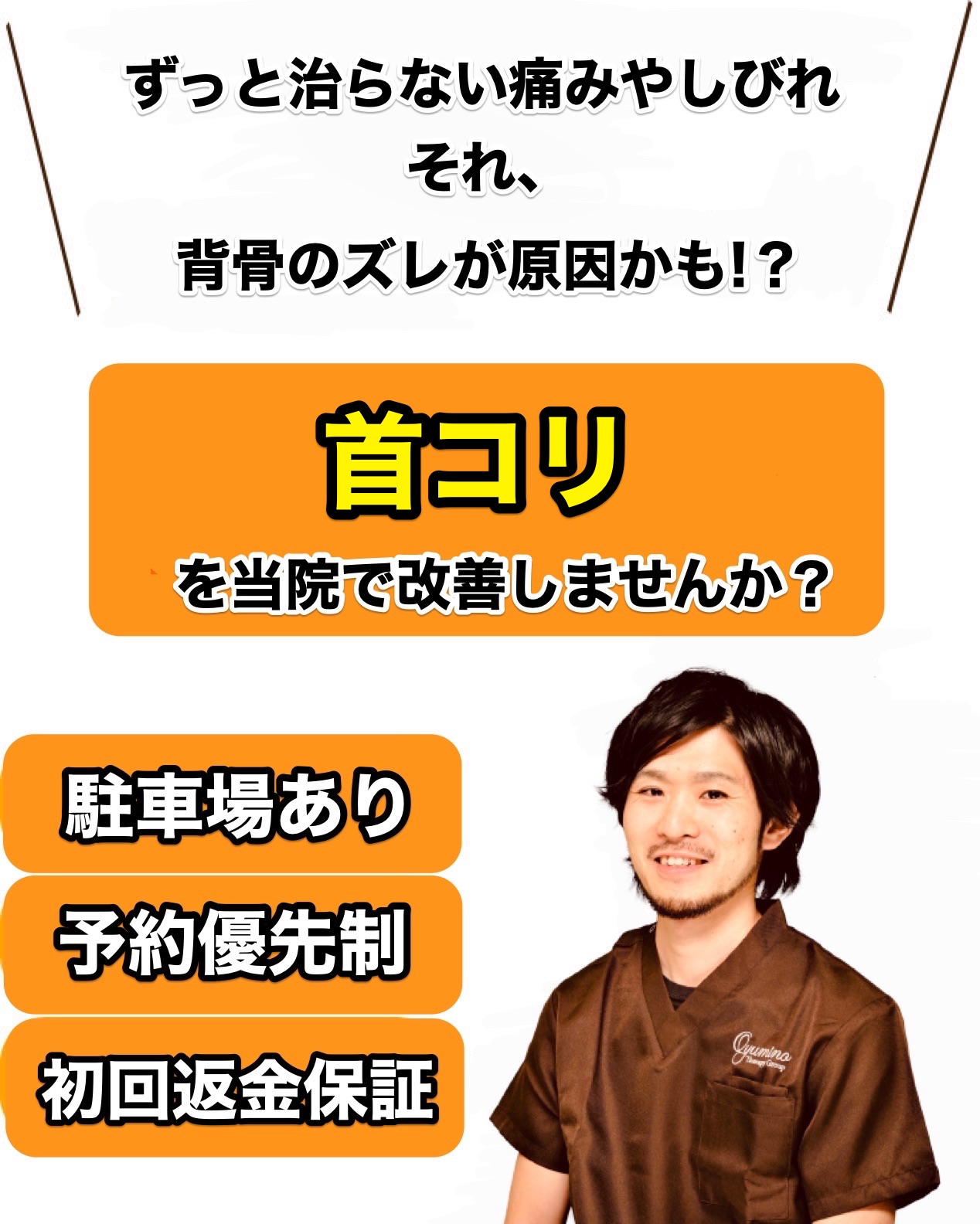 当院は首コリの施術に自信を持っています。初回に限り全く変化が無ければ完全返金保証いたします。ぜひ一度ご相談ください。
